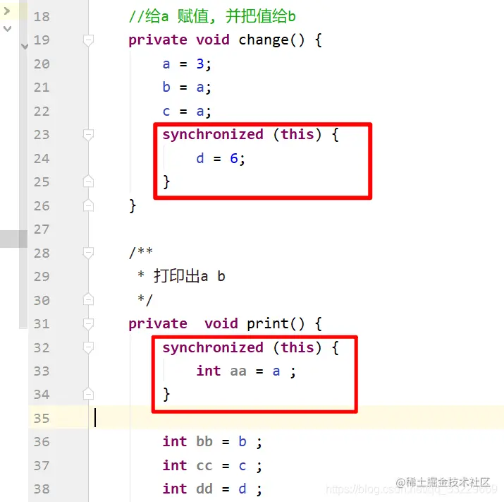 如下的代码中, 对可见性的代码进行了修改. 把赋值操作的方法中, 最后一个变量的赋值, 加上了synchronized修饰. 打印的方法中, 第一行代码加上了synchronized修饰. 这样就保证了原子性和可见性. 写线程在执行完成d=6的时候, 会释放锁. 打印的线程获得锁的时候, 就能知道写线程的所有的操作, 获得其最新的值.