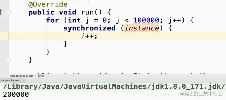 例如如下代码中的i++操作 , 使用了synchronized 代码块保护起来, 使得两个线程对其相加的时候, 可以正确的得出20万的结果.