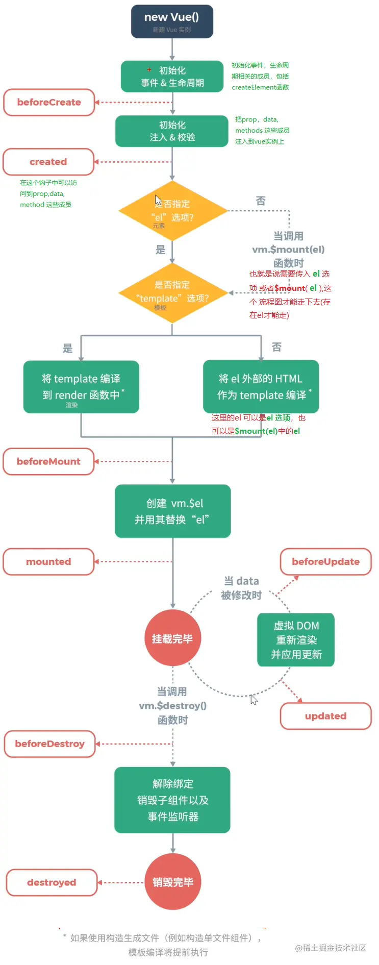 - (判断选项编译模板到render 中) -> beforeMount -> (把虚拟dom 转换为真实都没渲染到页面上)-> mounted (可直接访问挂载元素中的内容)