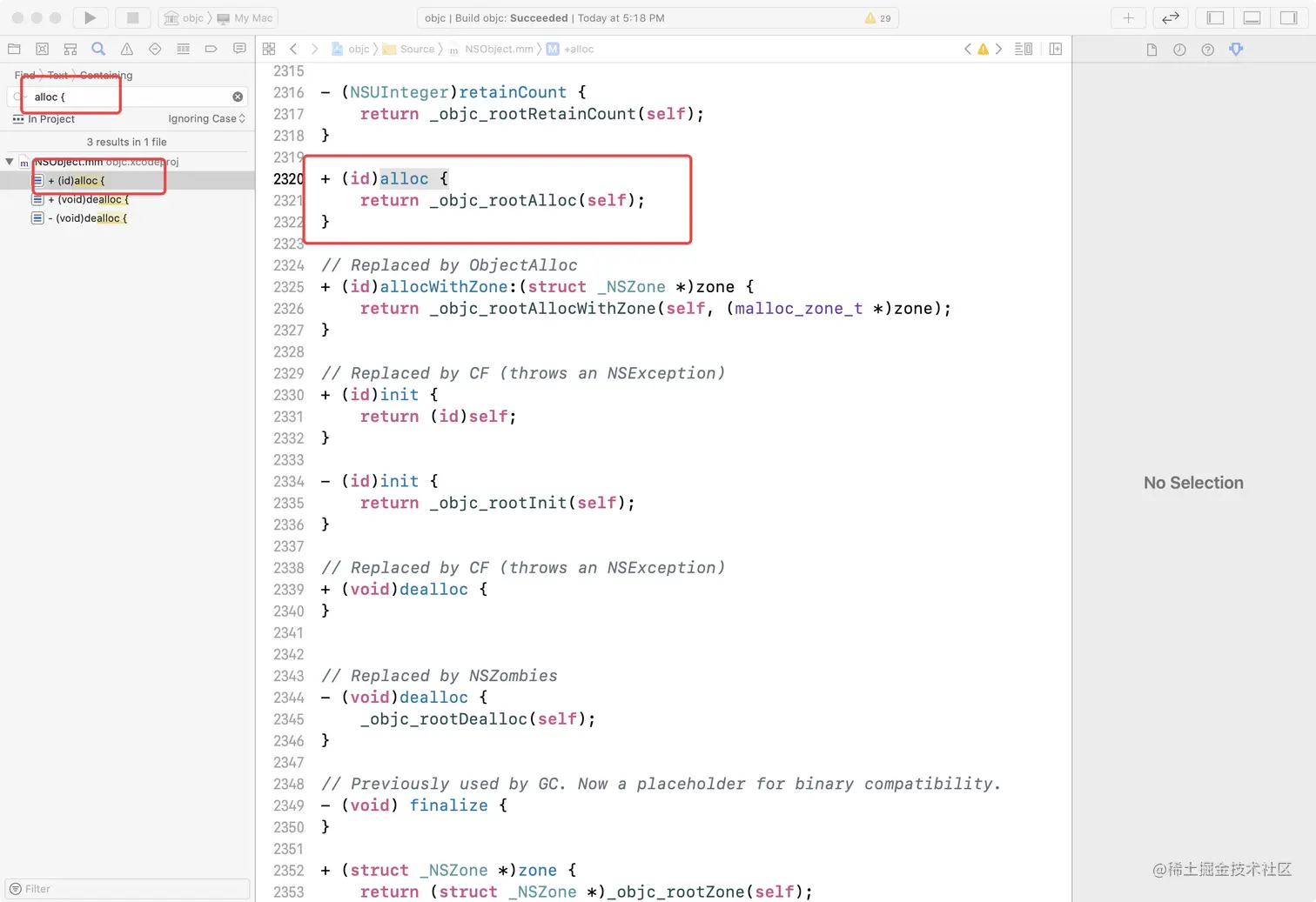 这里我们找到了"NSObject"的alloc类方法的实现,然后我们就可以一步一步的跟进去查看底层的实现并分析原理了
