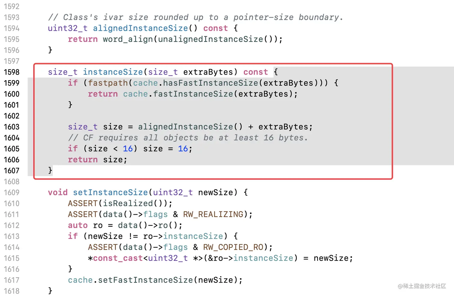 这个函数的返回值是一个size_t的数据,在calloc函数中会用到这个返回值。即请求开辟的内存空间大小,并且开辟的空间大小不小于16。而且调用的了alignedInstanceSize函数来进行字节对齐。即开辟的内存空间大小一定是16字节的整数倍。