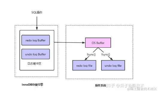 如上图所示,SQL操作之前会先记录redo log、undo log到日志缓冲区,日志缓冲区的数据会记录到os buffer中,再通过调用fsync()方法将日志记录到log file中