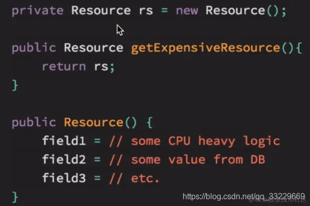 例如如下的Resource类中, 该类的构造方法的三个属性需要做比较消耗资源的操作, 例如从磁盘数据库中获取一些数据. 因此对于这种类, 最好是只用创建一次就行了, 节省资源和时间.
