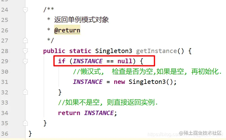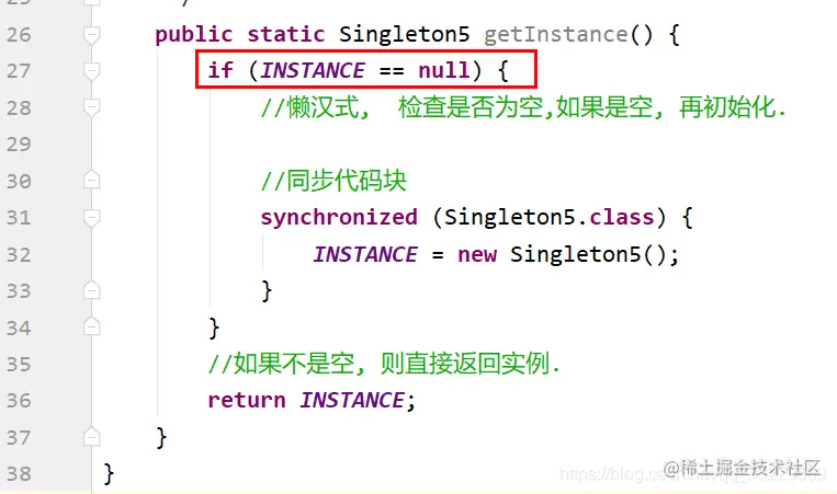 主要的问题出现在29行代码中 . 如果两个线程同时到达了此处, 并且此时实例也没有被初始化, 那么线程1会初始化该对象, 并且线程2 也会初始化此对象, 那么就会创建两个实例, 就不符合单例模式了.