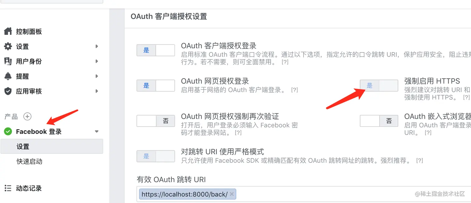 这之后添加产品,选择FaceBook登录,并且进行设置,将回调网址配置好,这是登录成功后跳转回网址的地址: