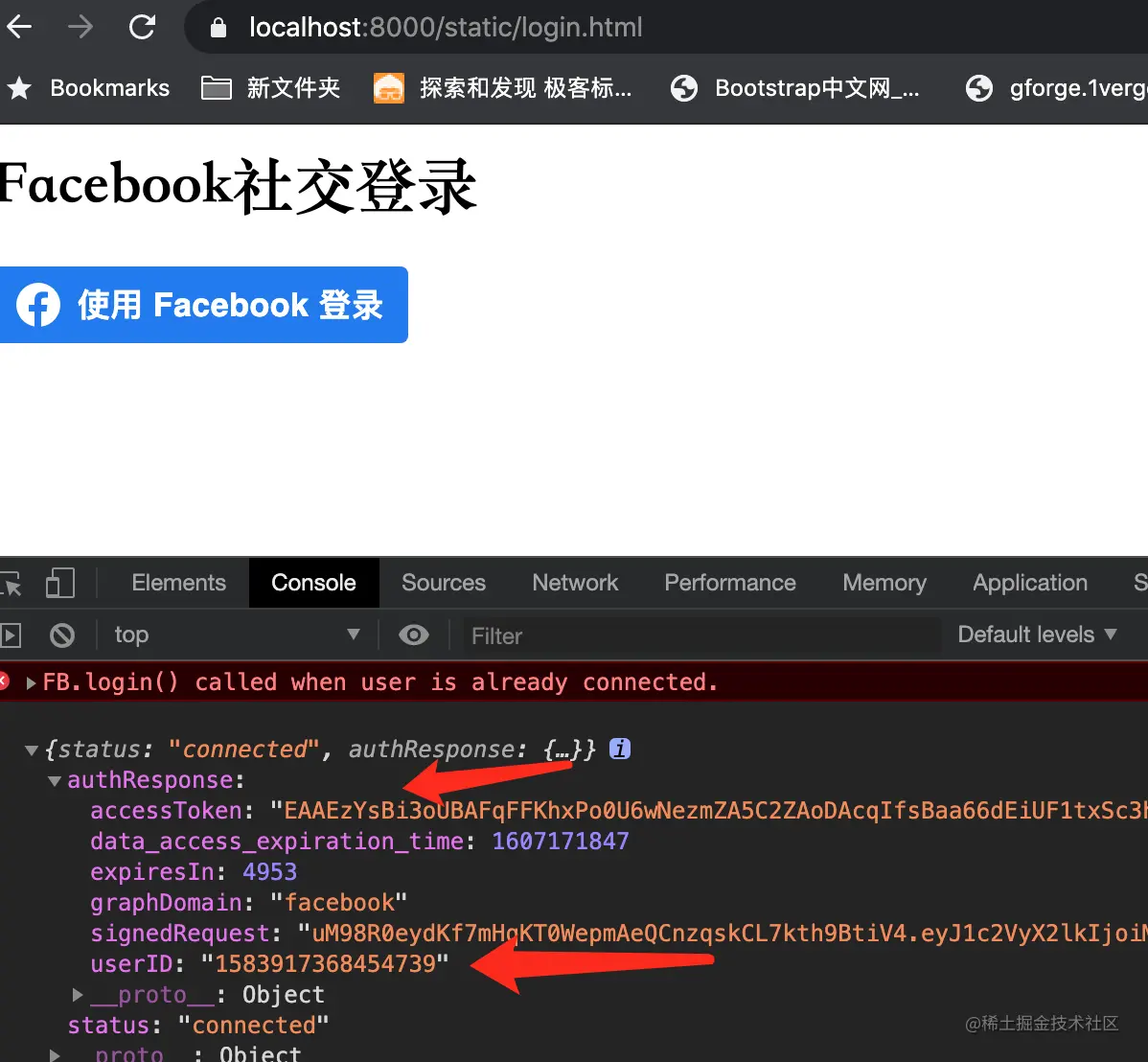 如果登录成功,FaceBook会将回调的用户id以及accesstoken返回给当前页面,前端只要进行获取就可以了: