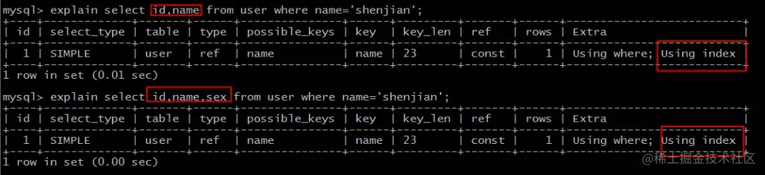 这个例子不再赘述,将单列索引(name)升级为联合索引(name, sex),即可避免回表。