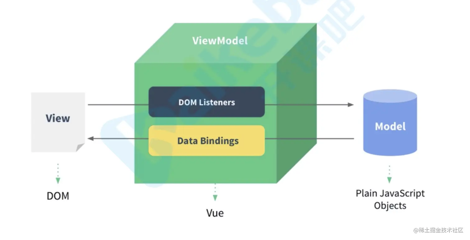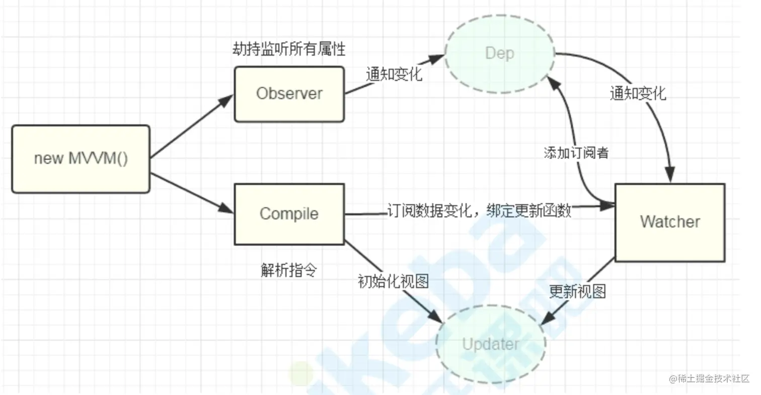 如图所示,数据的变化通过数据劫持去通知界面上的dom可以变更,dom的变化又有一个监听器去监听到他然后通知数据model层去改变。形成一个闭环。