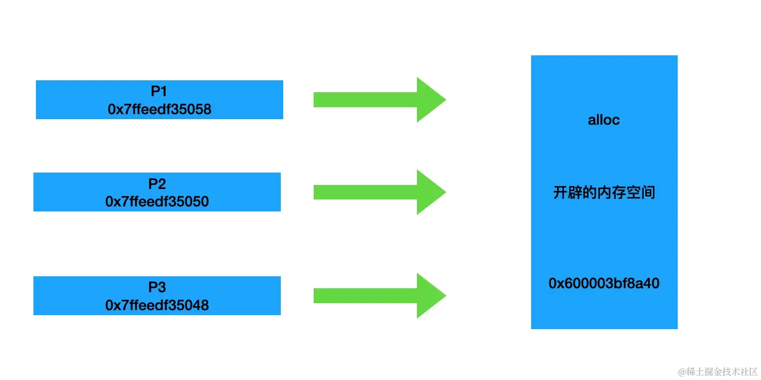 可以发现p1,p2,p3都指向了相同的地址空间,也就是说主要是alloc方法开辟了内存空间,init方法并没没有新开辟内存空间,接下来我们再来看一下alloc方法是如何来开辟和分配内存空间的: