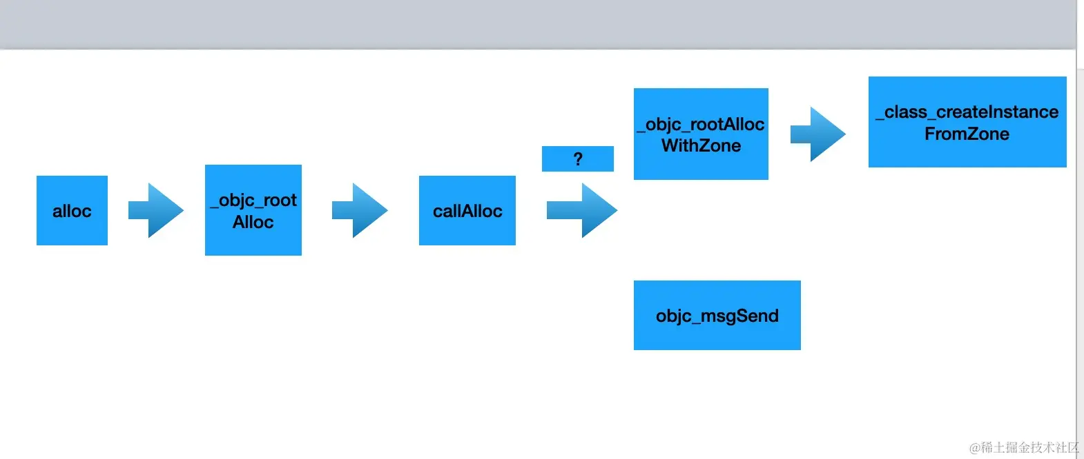 alloc -> _objc_rootAlloc -> callAlloc -> _objc_rootAllocWithZone -> _class_createInstanceFromZone 或者 alloc -> _objc_rootAlloc -> callAlloc -> objc_msgSend