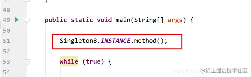 枚举的单例模式举例如下, 在要使用的类的方法中, 直接用单例的类名.单例对象.方法名即可使用.