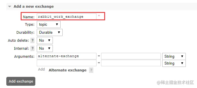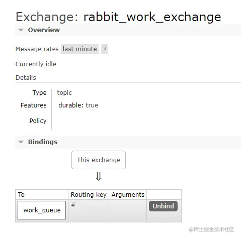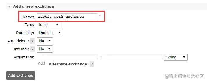 这里我们声明 Topic 类型交换机,名字为 -- rabbit_work_exchange