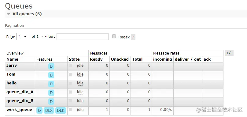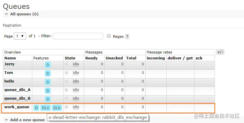 可以发现 work_queue 中的消息经过死信交换机被转发到了 queue_dlx_A 中,