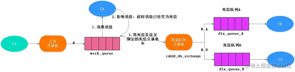 - 当这个队列中有死信时,RabbitMQ 就会自动的将这个消息重新发布到设置的 Exchange上去,进而被路由到另一个队列。