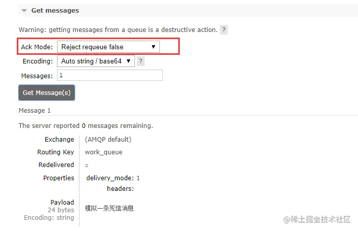 因为 web 控制台界面拒绝消息的方式只有两种,一个是 Nack message requeue true ,但是 requeue = true,消息会直接返回队列中,所以不行,这里选择的是 Reject requeue false。