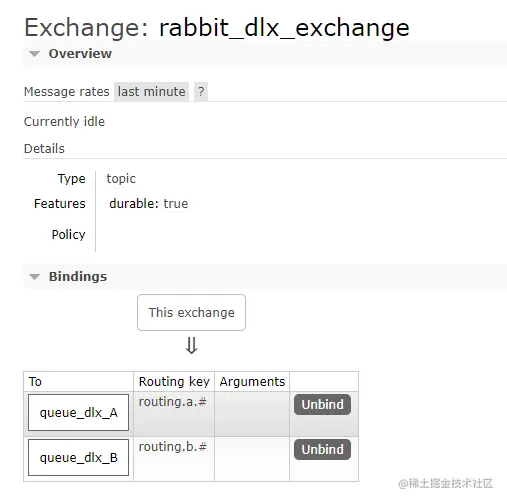 我们这里声明两个队列 ( queue_dlx_A,queue_dlx_B),并用两个不同的路由键 ( routing.a.#,routing.b.# ),绑定在死信交换机上,方便演示。
