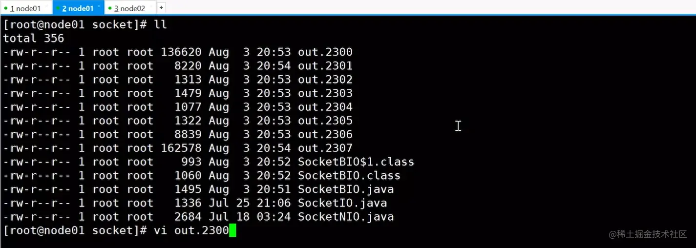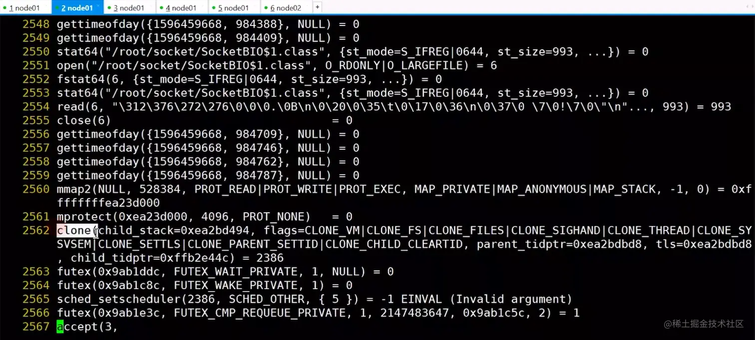 在执行上面代码的过程中,会调用系统调用函数,可以将这个类放在Linux虚拟机上查看运行过程,来更好的理解。使用strace -ff -o out java SocketBIO启动程序并追踪程序运行时所有线程的系统调用,以out开头的文件在当前目录下输出