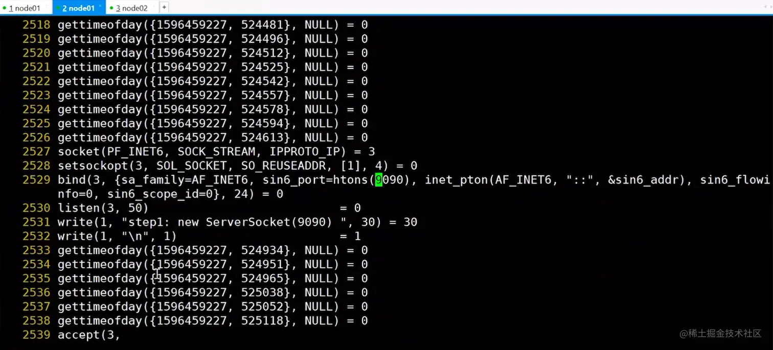 可以看到在执行new ServerSocket(9090)时,调用了socket、bind、listen系统调用函数。因为没有客户端连接进来,在执行server.accept()就发生了线程阻塞,系统调用也卡在了accept上,程序在等待客户端连接。