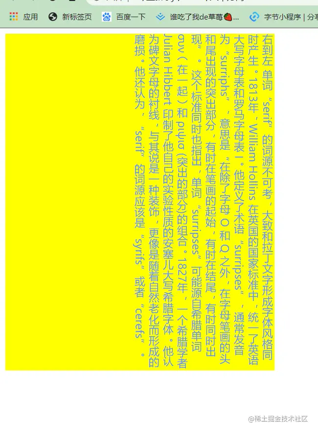 <div style="width: 400px; height: 500px; writing-mode: vertical-rl; text-orientation: mixed; background-color: yellow; color: cornflowerblue;">