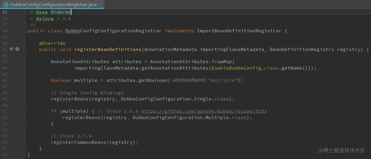 2、根据 @EnableDubboConfig 配置属性 multiple 决定是否注册 DubboConfigConfiguration.Multiple.class 的 BeanDefinition 信息