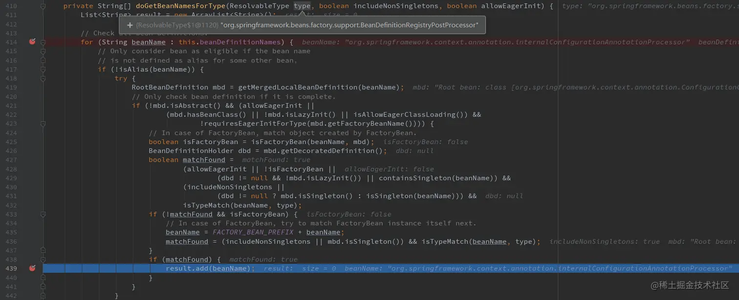 其中,在 PostProcessorRegistrationDelegate#invokeBeanFactoryPostProcessors 方法中,根据BeanDefinitionRegistryPostProcessor 类型获取 beanName, 根据一系列条件过滤后,结果为: org.springframework.context.annotation.internalConfigurationAnnotationProcessor,对应的 bean 为: ConfigurationClassPostProcessor (在步骤2中【注册配置类】注入)