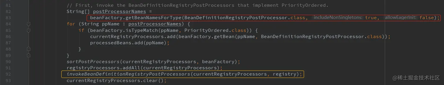 * 1、先处理实现了 PriorityOrdered 接口的 BeanDefinitionRegistryPostProcessor