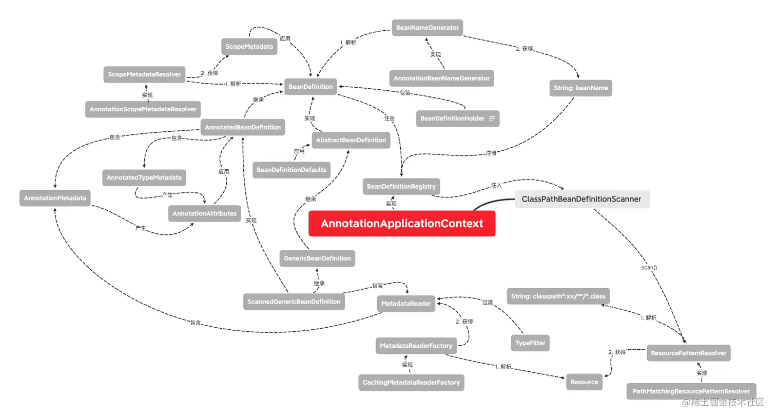 首先 AnnotationApplicationContext 的 scan() 是由内部的 ClassPathBeanDefinitionScanner 代劳的。ClassPathBeanDefinitionScanner 先是调用 ResourcePatternResolver 对 classpath 进行解析,得到一组 Resource——Resource 是对 classpath 上文件的抽象。遍历 Resource 集合,使用 MetadataReaderFactory 解析 Resource 获得 MetadataReader,同时使用 TypeFilter 对 MetadataReader 进行过滤。最后将 MetadataReader 包装成 ScannedGenericBeanDefinition,ScannedGenericBeanDefinition 是这个 scan 过程的初步输出。