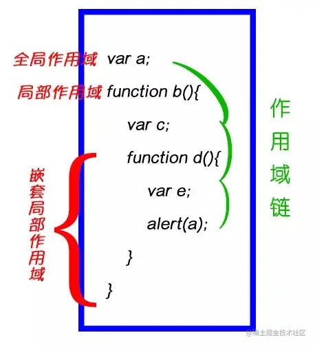 可以发现,在查找某变量(如上述的a变量)的时候,会先在(d函数)函数作用域中查找,若没有查找到,继续往外层(b函数作用域)查找,直到查找到全局作用域,然后停止查找。这是一个从里层往外层(从函数作用域到全局作用域)查找的过程,这就像是在顺着一条链条从下往上查找变量,而这条“链条”就称之为作用域链,就比如查找a变量时所依据的“链条”——d函数作用域->b函数作用域->全局作用域。