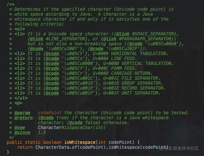 而且为了识别这些空格字符,从Java 1.5开始,还在Character类中添加了新的isWhitespace(int)方法。该方法使用unicode来标识空格字符。你可以在jkorpela.fi/chars/space… 了解更多关于unicode空格字符的信息。