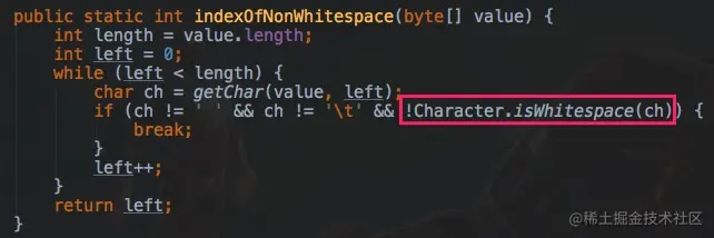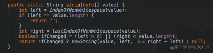而在Java 11中新增的这个strip方法就是使用这个Character.isWhitespace(int)方法来判断是否为空白字符并删除它们的: