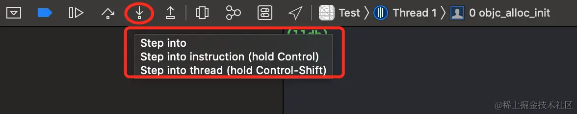 先运行,然后按住control并点击图示的箭头三次,然后将函数名objc_alloc_init加入到符号断点 (Step into instruction: 该指令代表单步执行CPU的指令,并跳入汇编的函数调用栈;如果用Step over instruction,虽然同样也是单步执行CPU的制定,但它不会跳入当前函数内部)