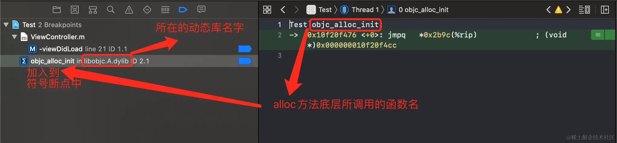 在测试项目中合适的地方写一个alloc方法,并所在行下一个断点