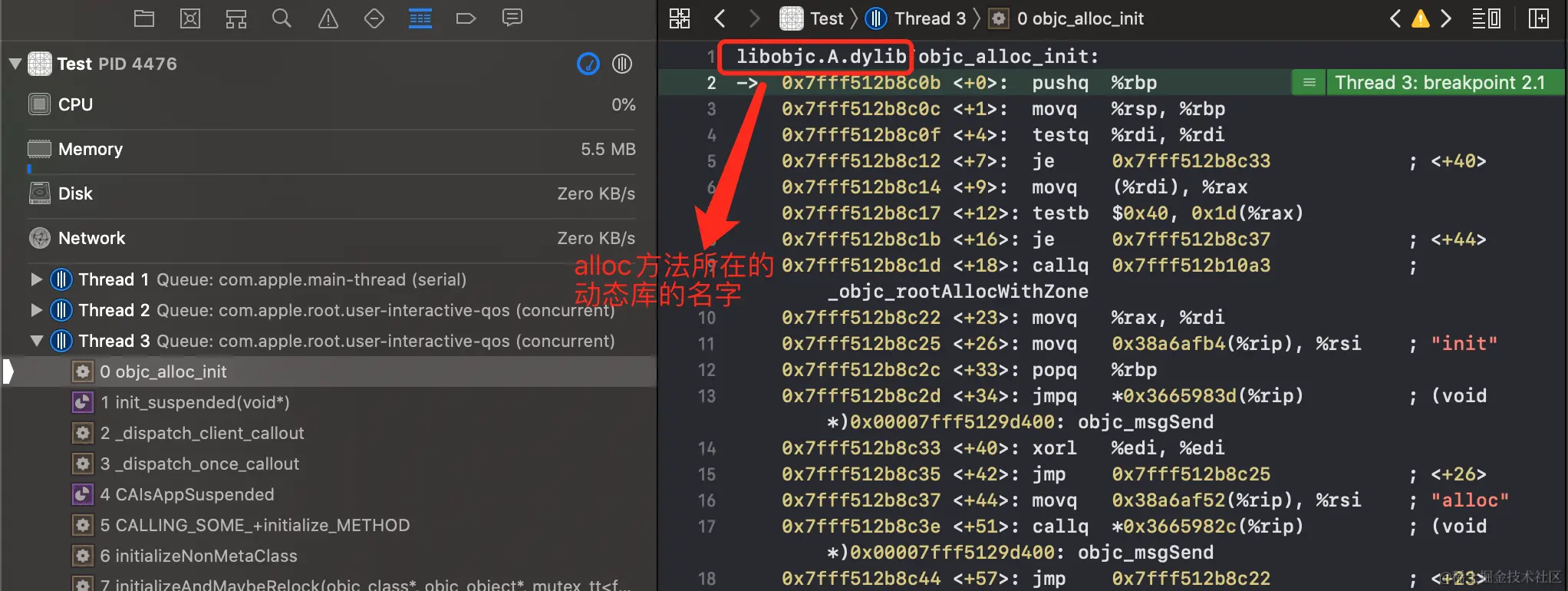 利用LLDB的三种调试方法之一,定位到alloc方法在底层所用到的动态库的名字: