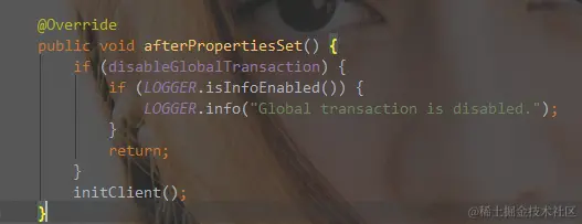 我们可以看到,首先会判断一个参数disableGlobalTransaction , 这个参数取值于配置文件中的service.disableGlobalTransaction , 是禁用全局事务的开关, 默认是false, 不禁用。