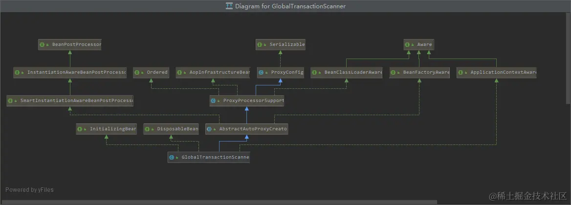 从类图我们可以看出, GlobalTransactionScanner 主要继承了 AbstractAutoProxyCreator 类,实现了 InitializingBean, ApplicationContextAware, DisposableBean接口。