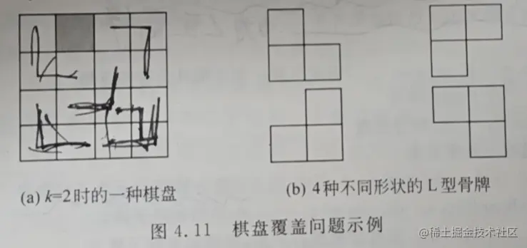 在一个2^k*2^k个方格组成的棋盘,恰有一个方格和其他方格不同,称该方格为特殊方格。棋盘覆盖问题要求用图4.11(b)所示的4种不同形状的L型骨牌股改给定棋盘上除特殊方格以外的所有方格,且任何两个L型骨牌不得重复覆盖。