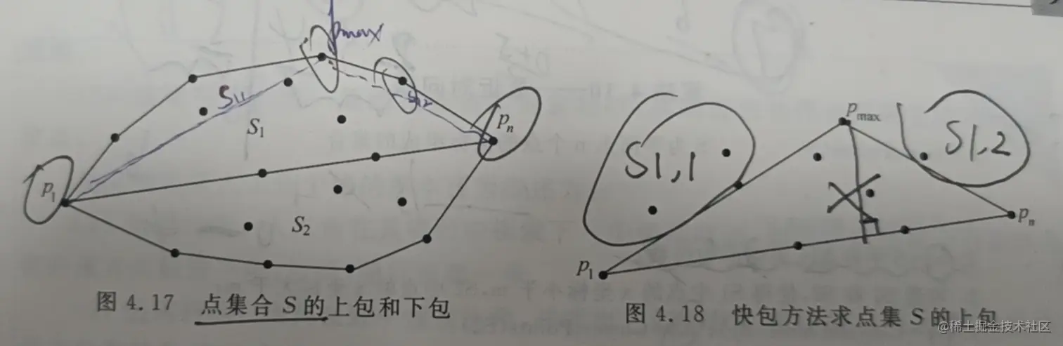 设p1=(x1,y1),p2=(x2,y2),……,pn=(xn,yn)是平面上n个点构成的集合S,并且这些点按照x轴坐标升序排列。几何学中有这样一个明显的事实:最左边的点p1和最右边的点pn一定是该集合的凸包顶点。p1pn连成的直线把S分为两个子集S1和S2。