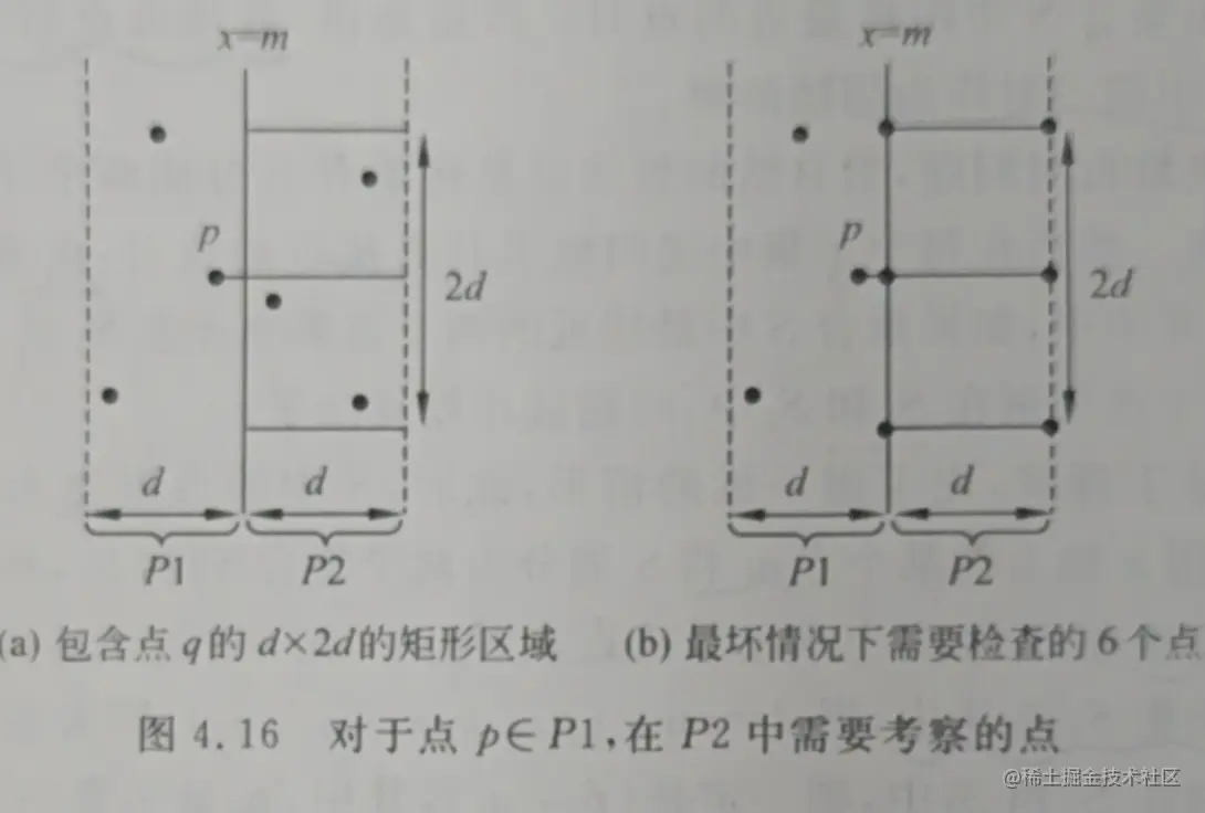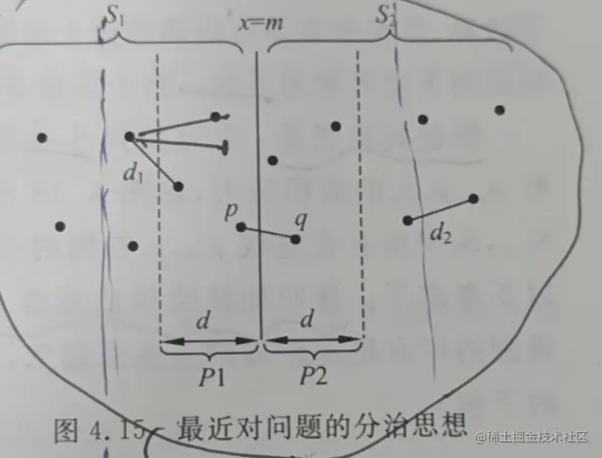 递归求出S1和S2的最小距离为d后,则S1和S2之前的最小距离必然位于P1和P2之间。