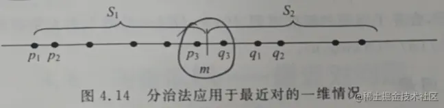 先考虑一维情况。此时S中的点退化为x轴上的n个点x1,x2,……,xn。用x轴上的某个点m将S划分为两个集合S1和S2,并且S1和S2含有点的个数相同。递归地在S1和S2上求出最接近点对(p1,p2)和(q1,q2),如果集合S中的最接近点对都在子集S1或S2中,则d=min{(p1,p2),(q1,q2)}即为所求,如果集合S中的最接近点对都在子集S1或S2中,则一定是(p3,q3),其中p3是子集S1的最大值,q3是子集S2的最小值。