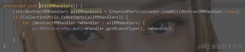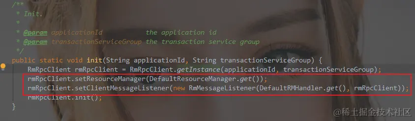 我们进入 RMClient的init方法,可以看到他比TM的创建流程多了两步, 设置ResourceManager(资源管理器)和ClientMessageListener(消息监听)。
