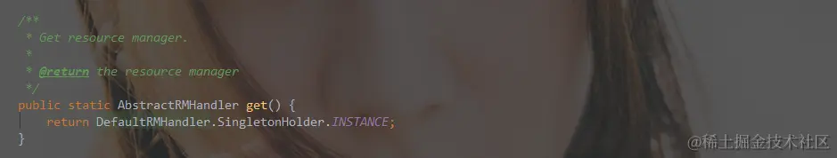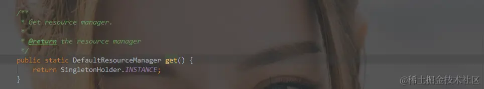 我们进入 DefaultResourceManager.get() 方法, 可以看到这也是个经典的单例, 使用内部类实现的。