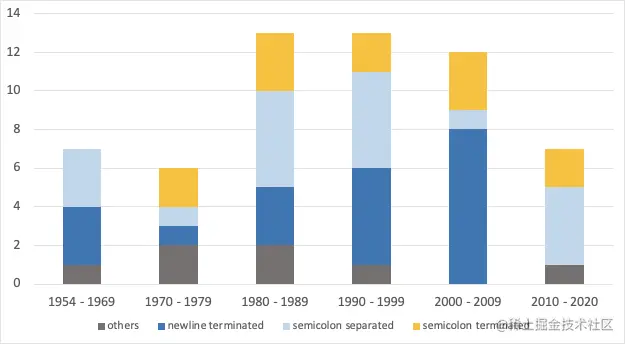从这张图中,我们可以清楚地看到,几十年来,坚持使用分号结束符的新语言的数量要比一直尝试不使用分号结束符的语言少得多。这种情况甚至发生在最近的十年,像Rust和Dart这样的新语言仍然应用了分号语句终止符的需求。