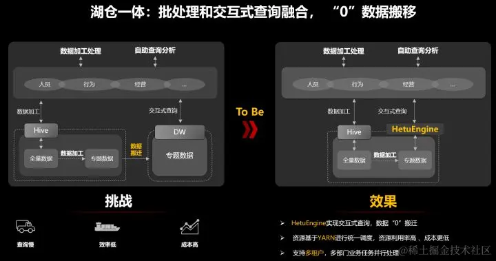 FusionInsight MRS通过湖仓一体的解决方案完美解决上述问题。**在湖仓一体解决方案中,数据在同一HDFS存储层内部闭环,数据加工和分析不出湖,数据“0”搬迁;Hive批加工引擎和HetuEngine交互式查询引擎基于YARN进行统一资源调度,资源利用率高,成本更低;**MRS构建了多租户体系,可以为Hive加工、HetuEngine交互式分析配置不同的租户,实现多部门业务并行处理,安全性和可扩展性较好。