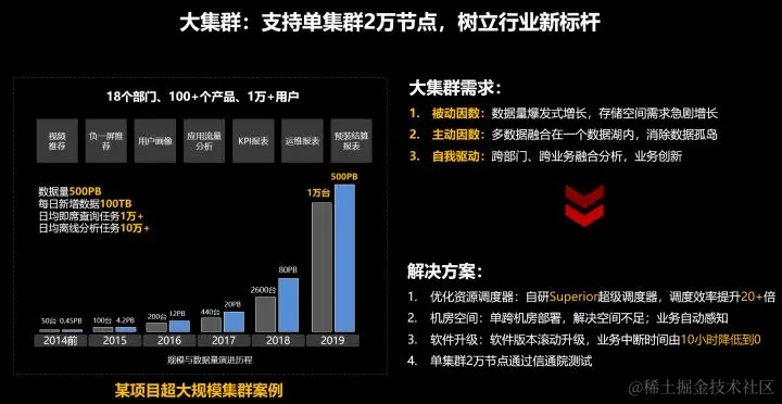**第一点:**数据量的快速增长,意味着Hadoop原生态2000节点的集群规模已经无法满足数据存储需求,更大规模的集群节点,更大的存储容量,以及与之匹配的计算性能,成为大数据发展的趋势之一;
