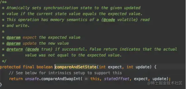 3、compareAndSetState(int expect, int update):通过CAS设置当前状态,该方法能保证状态设置的原子性
