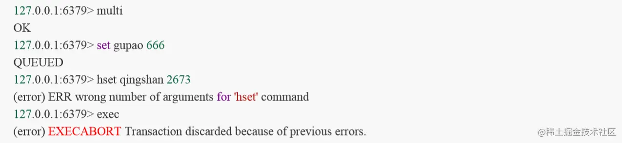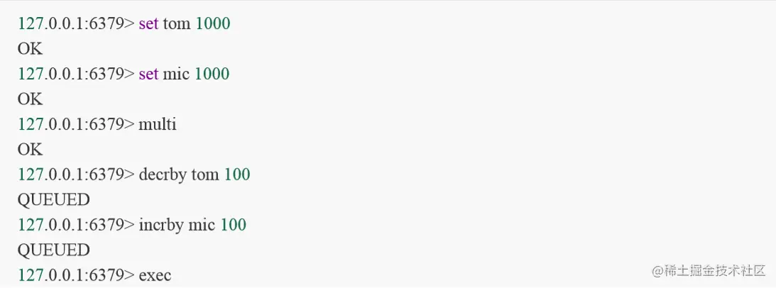 通过exec的命令执行事务。如果没有执行exec,所有的命令都不会被执行。