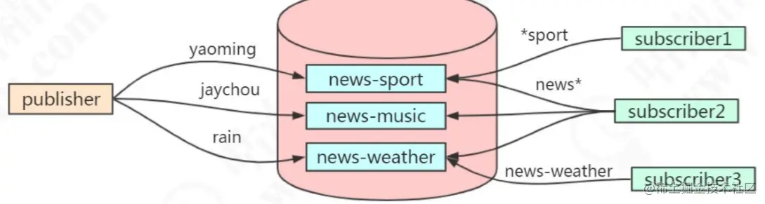 首先,我们有很多的频道(channel),我们也可以把这个频道理解成 queue。订阅者可以订阅一个或者多个频道。消息的发布者(生产者)可以给指定的频道发布消息。