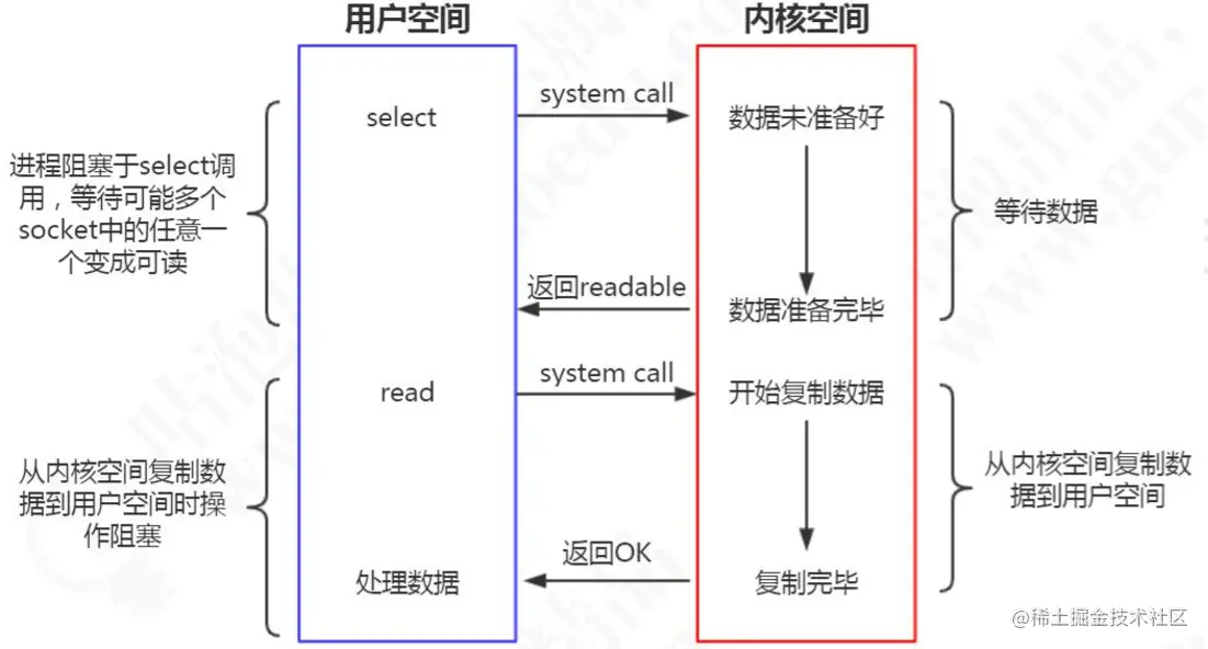 多路复用有很多的实现,以select为例,当用户进程调用了多路复用器,进程会被阻塞。内核会监视多路复用器负责的所有socket,当任何一个socket的数据准备好了,多路复用器就会返回。这时候用户进程再调用read操作,把数据从内核缓冲区拷贝到用户空间。