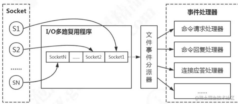 客户端在操作的时候,会产生具有不同事件类型的socket。在服务端,I/O 多路复用程序(I/OMultiplexingModule)会把消息放入队列中,然后通过文件事件分派器(Fileevent Dispatcher),转发到不同的事件处理器中。