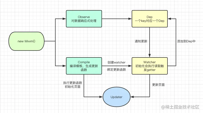 - Watcher:负责执行更新函数(每一个模板中用到的数据都会对应一个 Watcher)